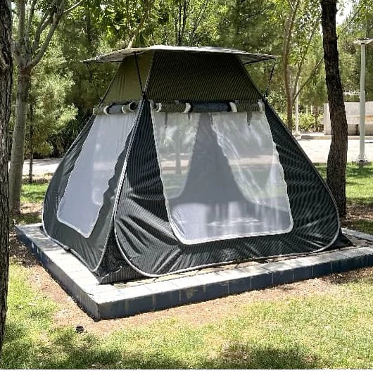 دارای چهار درب بزگ و توری دارای پنجره بر روی درب ها سقف باز و بزرگ ارتفاع بلند کف ضخیم قلاب دور چادر نوار ابریشم محافظ فنر 2/5 طول 2/5 عرض ارتفاع210 سایبان روی سقف ضدآب و ضد آفتاب رنگبندی ارسال به صورت روزانه با پست و پیک بالاترین کیفیت موجود در کشور