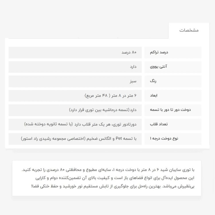 توری سایبان شید،6در 8، دوخت درجه1، 80درصد
