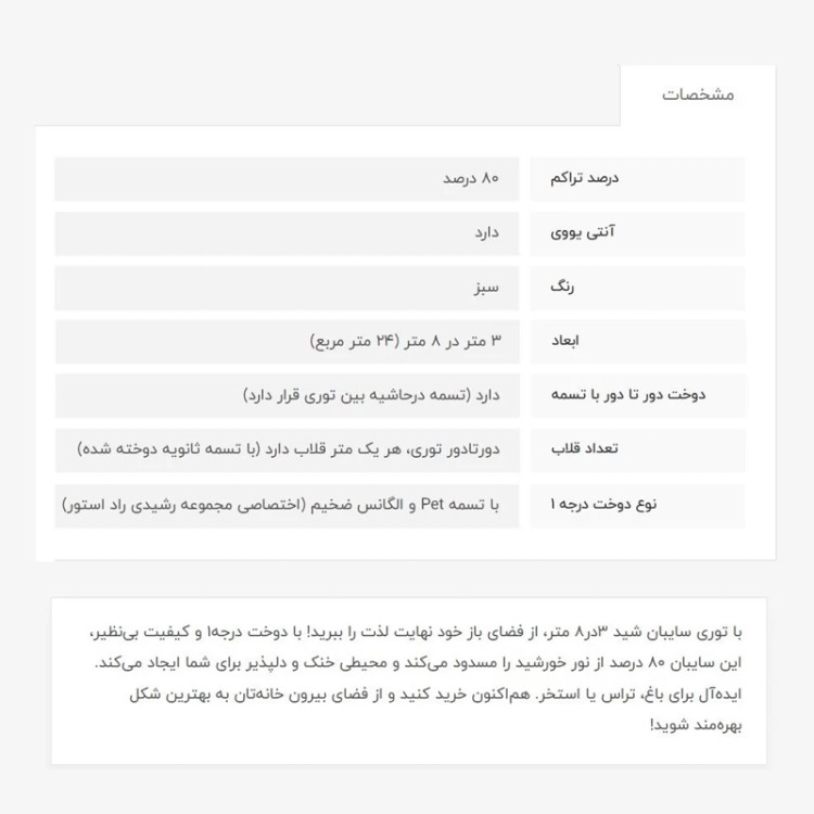 توری سایبان شید، 3در8،دوخت درجه1، 80درصد